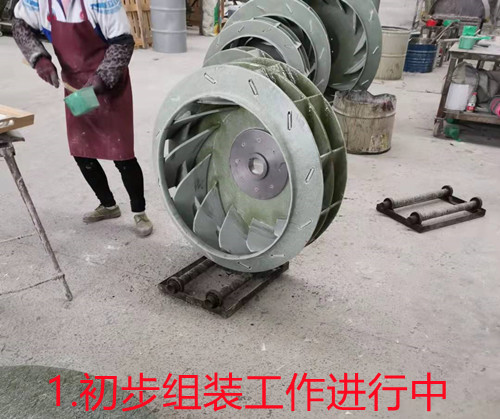 a、首先是將玻璃鋼風(fēng)機葉輪需要的配件單獨制作出來,如葉片、底座、頂蓋、等。然后人工進行組裝,組裝工作完成之后再使用樹脂混合材料進行加固。
