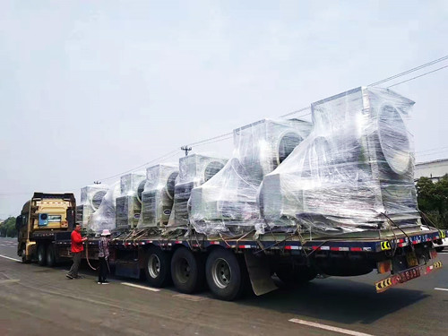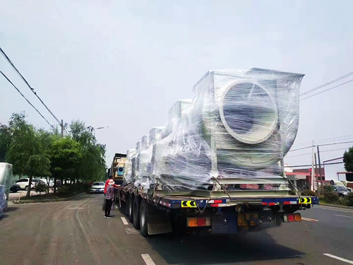 上個月山東某客戶在我司訂購的一批6臺14C75KW的玻璃鋼離心風機今天發貨,之所以交貨期多達一個月,主要是因為這一批風機使用的電動機為變頻防爆專用電機,電機需要進行定制。在發貨前使用透明塑料模對風機進行了整體的包裹。